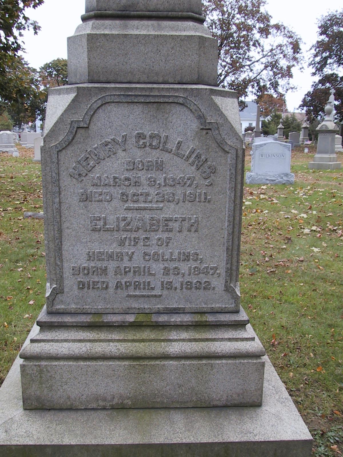 HENRY2 COLLINS (William1) was born at Ashton-under-Lyne, Lancashire, England, on 9 March 1847 a son of William Wright Collins and his wife Selina Hibbert. He died at Pawtucket, Providence County, Rhode Island, on 28 October 1911. He married at Lonsdale, Smithfield Town (later Lincoln Town), Providence County, Rhode Island, on 25 November 1868 ELIZABETH HOLLINGWORTH. She was born at Ashton-under-Lyne on 26 April 1847, a daughter of Elijah Hollingworth and his wife Hannah Duncalf. She died at New York City, New York, on 15 April 1932.[1]