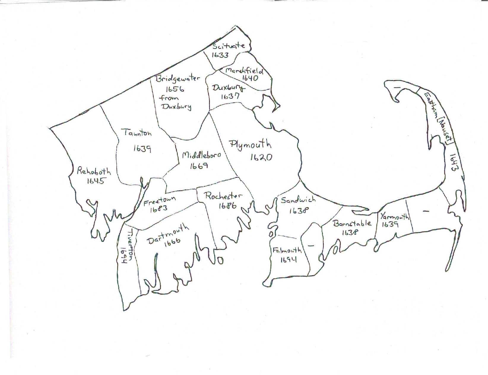 Plymouth Colony was settled by towns, in the following manner: (1) The Colony purchased land from the Indians; (2) The colony granted to a group of persons, "proprietors," the rights to settle that land; (3) The proprietors would either settle the land or sell their rights to others who would settle; (4) the Town would be incorporated. With the passage of time, and increase of population, many towns would be subdivided into smaller towns. This first map shows the original Towns of Plymouth Colony: