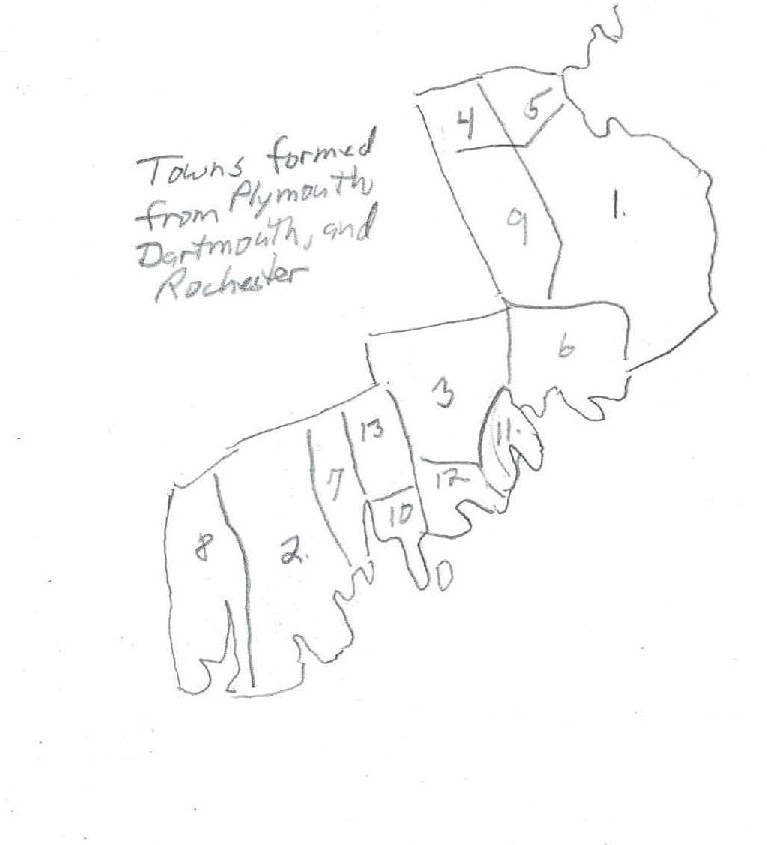 The following map shows the subdivision of the three Towns most important to this line of Hathaway family history, Plymouth, Dartmouth and Rochester, into smaller Towns.