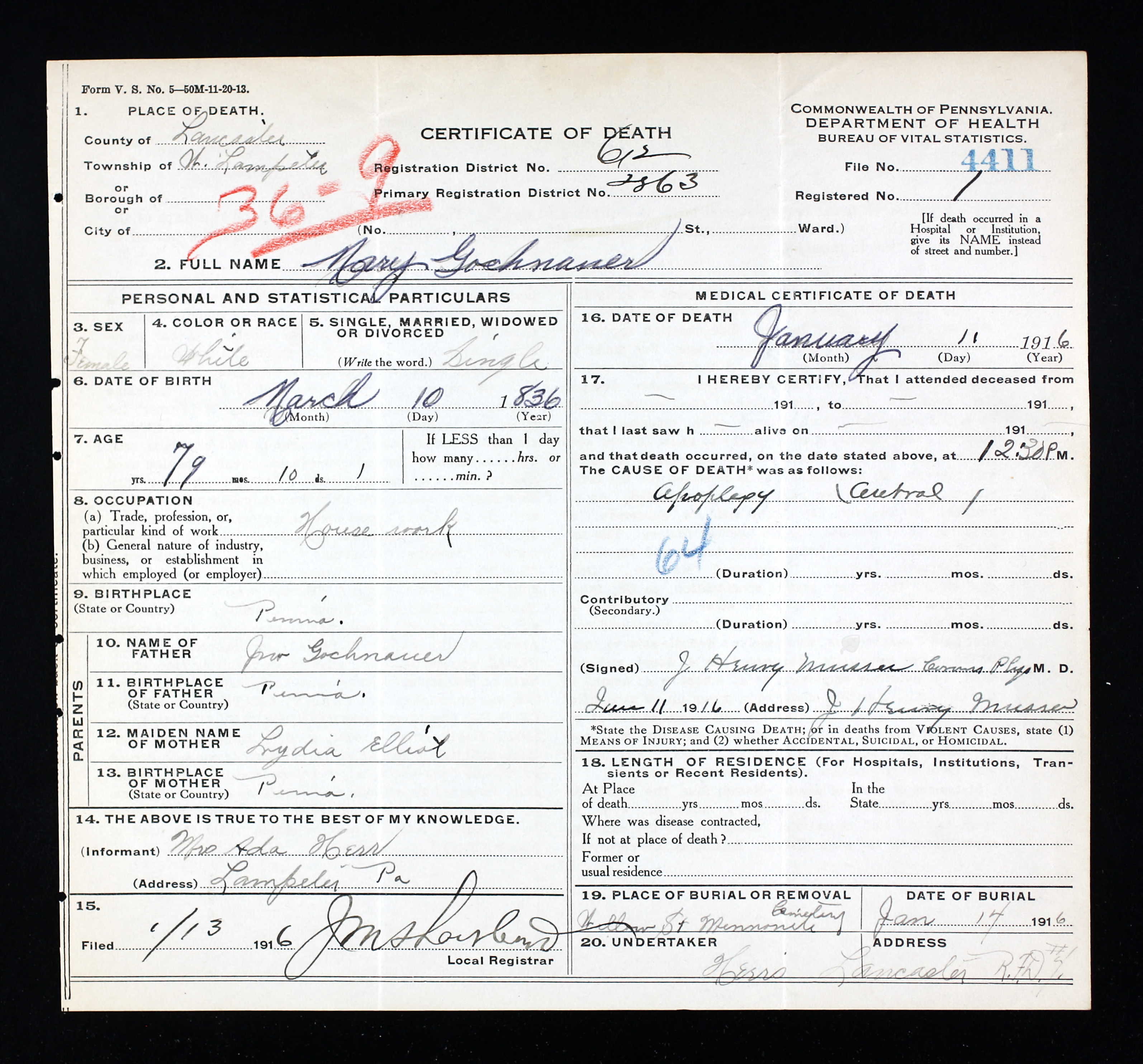 14Pennsylvania Department of Health, Death Certificates, 1906–1967, certificate 4411, Mary Gochnauer, 1916.