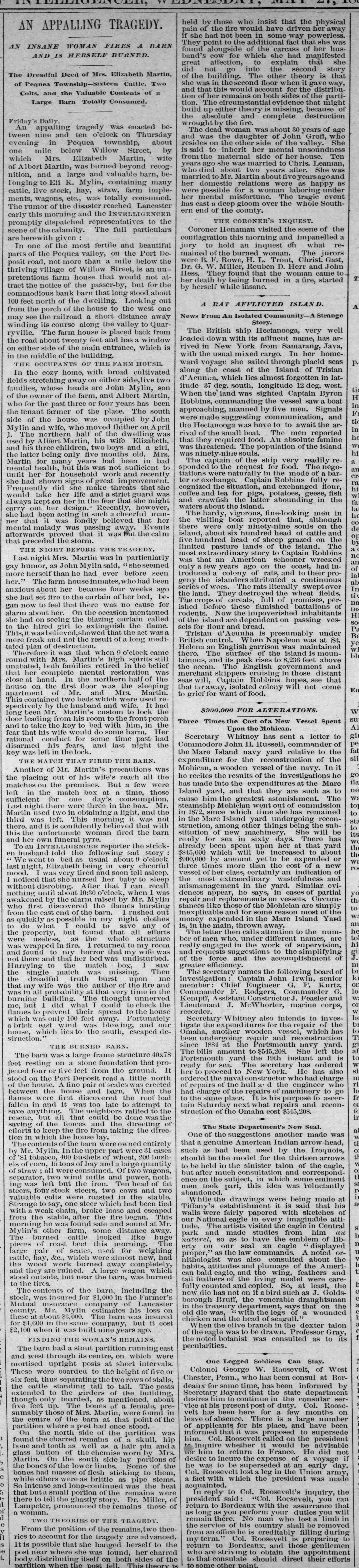 4"An Appaling Tragedy," Lancaster (Pennsylvania) Weekly Intelligencer, 27 May 1885; Newspapers (newspapers.com : 14 October 2019 ). p. 5.