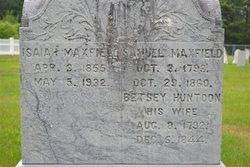 SAMUEL5 MAXFIELD (Samuel4, Michael3, John2-1) was born at Gilmanton, Strafford County, New Hampshire, on 3 October 1793 a son of Samuel Maxfield and his wife Abigail Gilman. He died at Gilmanton on 29 October 1860.[1] He married at Upper Gilmanton Parish (later Belmont), Gilmanton on 4 January 1816 BETSEY HUNTOON.[2] She was born at Gilmanton on 8 August 1792, a daughter of Joshua Huntoon and Mary C. Winslow. She died on 5 December 1844.[3]