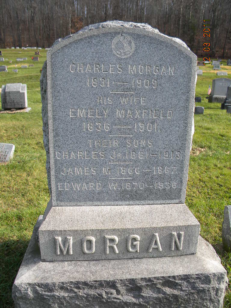 The 1880 census reported the Charles Morgan family at New Milford, Susquehanna County, Pennsylvania, where Charles was employed as an engineer for a tannery. New Milford was a small community in the mountains of northeast Pennsylvania, which in 1880 had a population of 803. The family consisted of Charles W. Morgan, 49, Emily (Maxfield) Morgan, 44, and youngest child Edward Francis Morgan, 9.[21] James Maxfield died in 1898, age 91, and was buried at New Milford. The 1900 census reported Charles W. Morgan, 69, engineer for a tannery, living at New Milford with his wife, Emily, 64, and thier single son, Edward, 29, a teacher.[22] Son Charles Morgan resided in 1900 in New Milford township, Susquehanna County, where he operated a rented farm, with his wife Sarah and their daughter Emma.[23] Emily (Maxfield) Morgan died at New Milford in 1901, her husband Charles died there in 1907. Their graves may be found at New Milford Cemetery.[24]