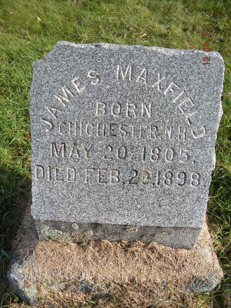 JAMES6 MAXFIELD (James5, John4, Michael3, John2-1) was born at Chichester, Rockingham County, New Hampshire, on 5 June 1806[1] a son of James French Maxfield and his wife Rachel Blake. He died on 23 February 1898.[2] He published intentions to marry first at Salem, Essex County, Massachusetts, on 14 November 1835 EMILY KENNY or KINNEY.[3] She was born at Salem about 1813, a daughter of Ebenezer and M. Kenny. She died at Salem on 15 April 1851.[4] He married second at Hookset, Merrimack County, New Hampshire, on 29 December 1852 MARY JANE JOHNSON.[5] She was born at Pittsfield, Merrimack County, on 29 June 1828, a daughter of John Johnson and Judith Joy. She died at Pittsfield on 26 August 1918.[6]