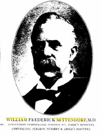 William Frederick Mittendorf became a noted ophthalmologist, with an office at 140 Madison Avenue in New York City. He lived around the corner at 123 East 25th Street. He held appointments as surgeon at New York Eye and Ear Infermary and held the position of Ophthalmic surgeon at Belleview Hospital. He wrote two books, Disease of the Eye and Ear (1881) and Granular Lids and Contageous Diseases of the Eye (1896). He died in 1919 at his second home, "Four Acres," in Crugers. William was buried at the family plot at Sleepy Hollow Cemetery in Tarrytown, Westchester County, New York. [13] He is credited with discovering the Mittendorf dot. The following obituary is from an unidentified newspaper:[14]